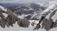 Ahora vamos ascendiendo ligeramente cerca de unos cientos de metros hasta visualizar a nuestra izquierda una canal que cada vez se va estrechando mas segun la subimos, la cual nos conduce a nuestra Gruta Helada (derecha y abajo escondida) y si seguimos ascendiendola hasta el pico de Tortiellas.